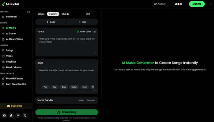 Musicful is a beginner-friendly guitar solo generator online free platform focused on fast results. Users can generate solos or riffs in seconds using simple prompts. It also functions as a guitar riff generator AI, offering structured loops that fit modern genres like pop, EDM, and hybrid rock.