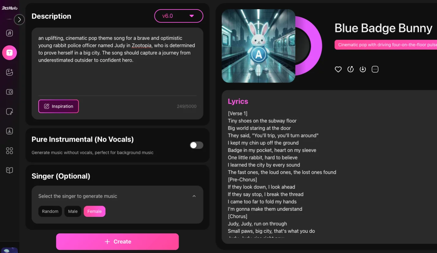 - Text to Song: Describe the vibe in detail. For example, an uplifting, cinematic pop theme song for a brave and optimistic young rabbit police officer named Judy in Zootopia, who is determined to prove herself in a big city. The song should capture a journey from underestimated outsider to confident hero.