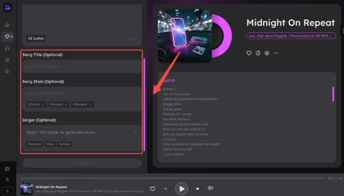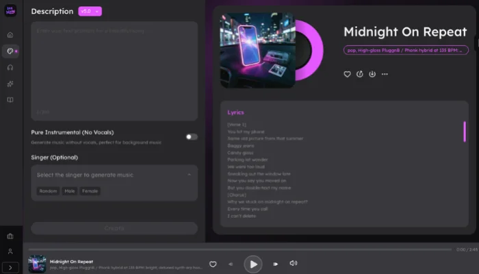Select between Random, Male, or Female vocal styles within the "Singer" section. Turn on the "Pure Instrumental" switch if you requires background music without any lyrics.