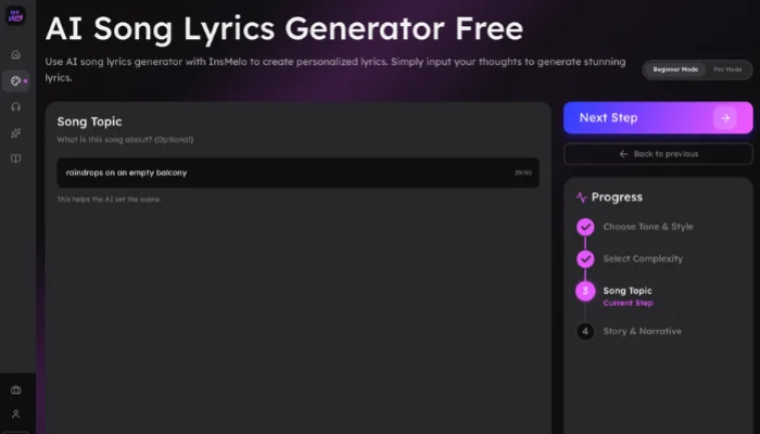 For those struggling to find the right words, the InsMelo lyrics generator serves as a sophisticated co-writer. It suggests authentic metaphors and sensory details. If you need a sad song to make you cry, the tool focuses on specific imagery to ground the emotion.