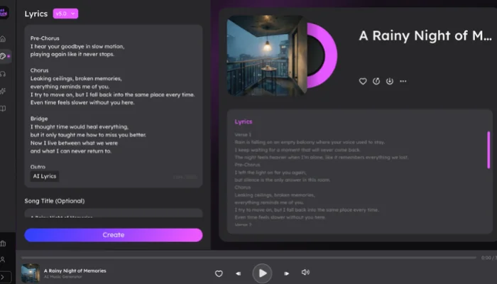 Input a theme and provide specific details. Instead of just typing "breakup," I tried "raindrops on an empty balcony," and the AI suggested a stunning metaphor about "leaking ceilings and hollow hearts." This level of detail is what separates a generic track from a soulful one.