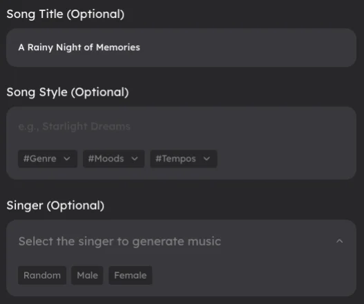 Set your song title, choose a song style, and select the vocal gender to match your creative direction.