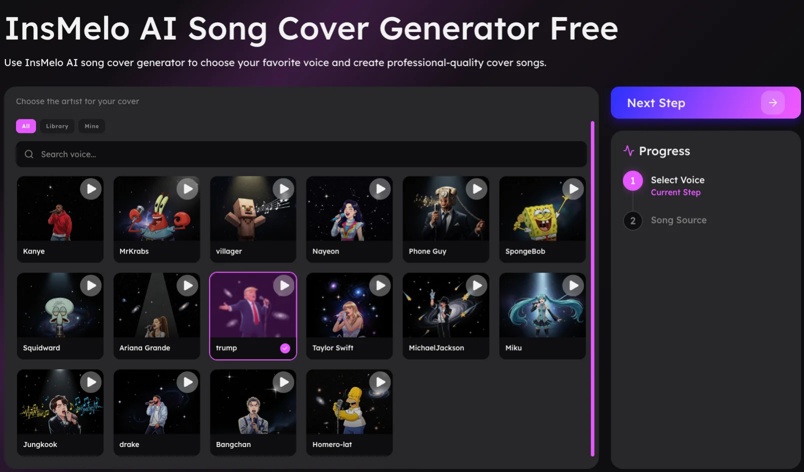 Visit InsMelo AI Song Cover Generator page, browse the AI voice library and pick Trump voice.