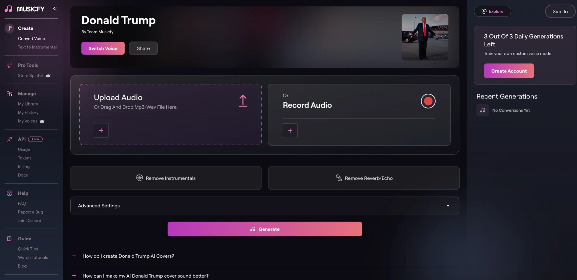 Many creators use Musicfy to create viral covers with celebrity AI voices, including Trump.