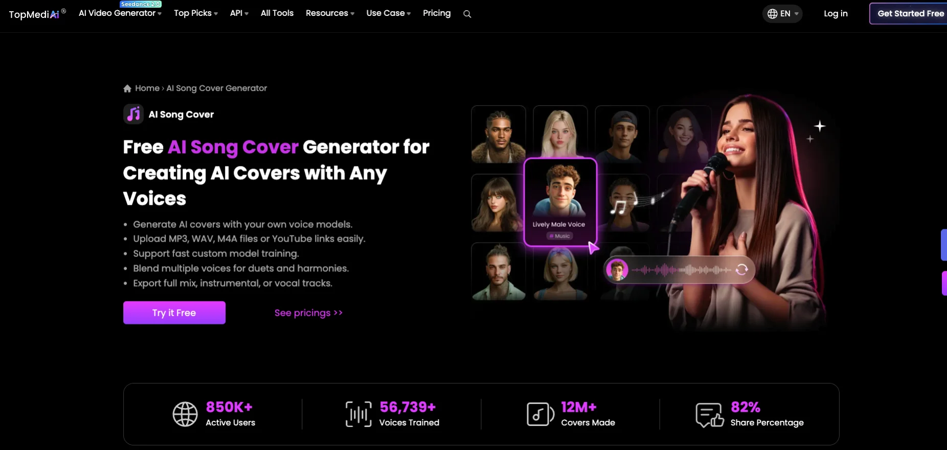 TopMediai offers powerful AI voice cloning and music cover generation tools. It focuses on high-quality voice synthesis.
