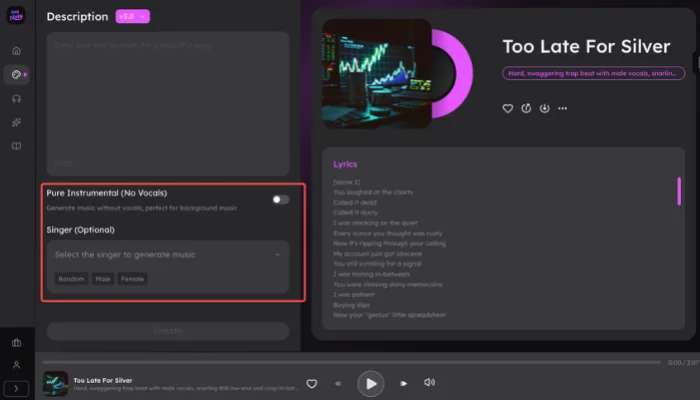 Step 2: Customize vocal settings. Toggle the pure instrumental switch for background tracks or select a specific singer gender to define the vocal performance.