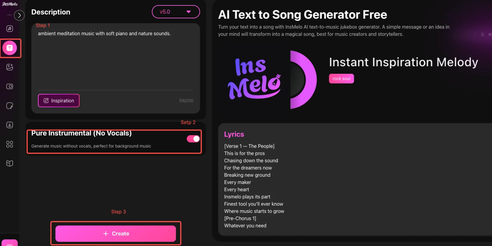 Using InsMelo AI text to song generator to create meditation music is quite easy and smooth.