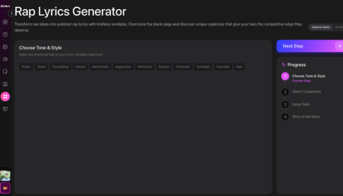 Step 1: Choose Tone & Style: Select the desired emotional vibe (e.g., Poetic, Aggressive, Cinematic) and musical sub-genre (e.g., boom bap, trap, drill) to determine the rhythm and rhyme density.