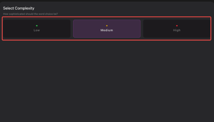 Step 2: Select Complexity: Set the technical sophistication level of the word choice and rhyme schemes (Low, Medium, or High).